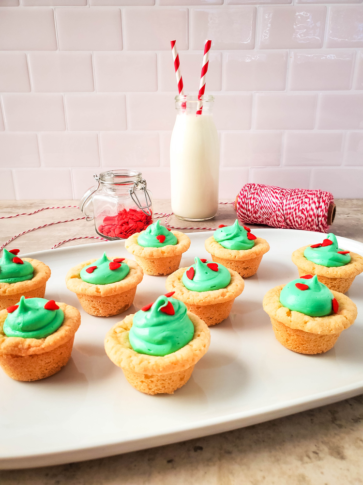 So what exactly are Grinch-inspired cookie cups? Simply put, they are miniature chocolate chip cookies baked in a mini muffin tin and then shaped into little cups. These cups are then filled with green-tinted frosting and topped with a red candy heart, resembling the iconic image of The Grinch's heart growing three sizes.