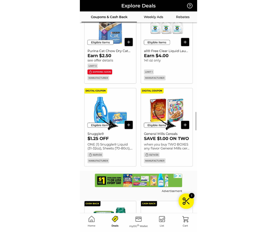 Clip the coupons you want to use by tapping the “+” icon. Be cautious not to clip too many, as Dollar General applies the lowest-value coupon first. Plan your clips to maximize your savings.