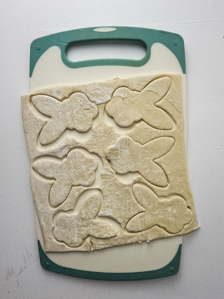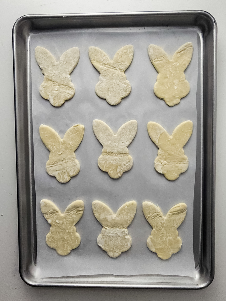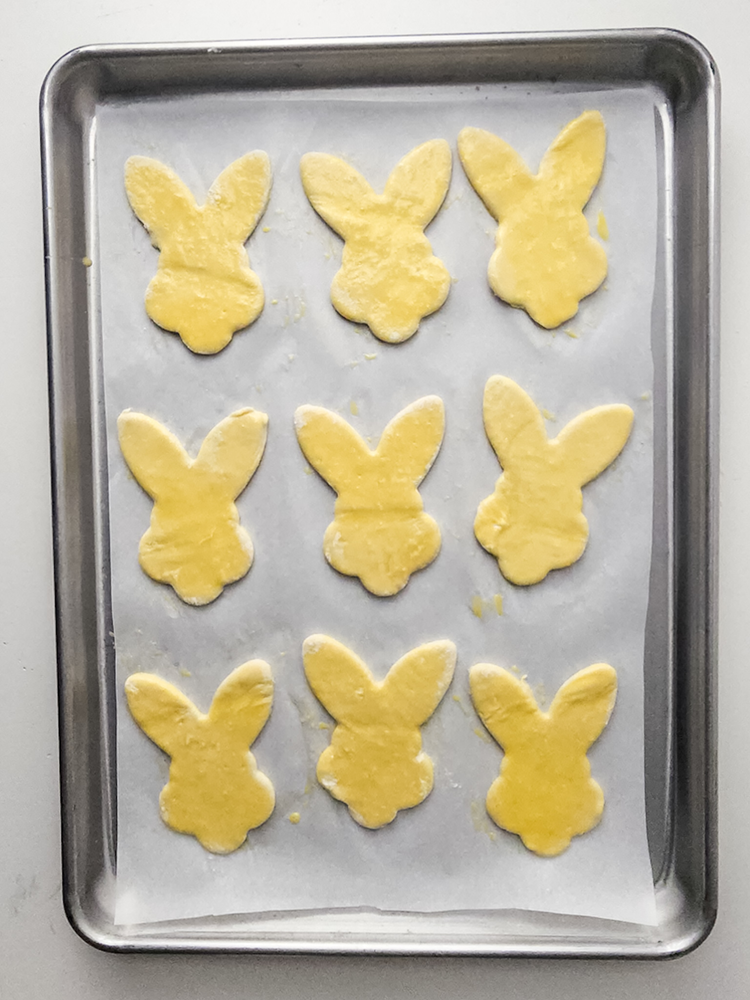 Preheat the oven to 375 degrees Fahrenheit. Use a bunny cookie cutter to cut out as many bunnies as you can in each sheet. Place on a baking sheet prepared with parchment paper, fitting only 8 on each sheet.