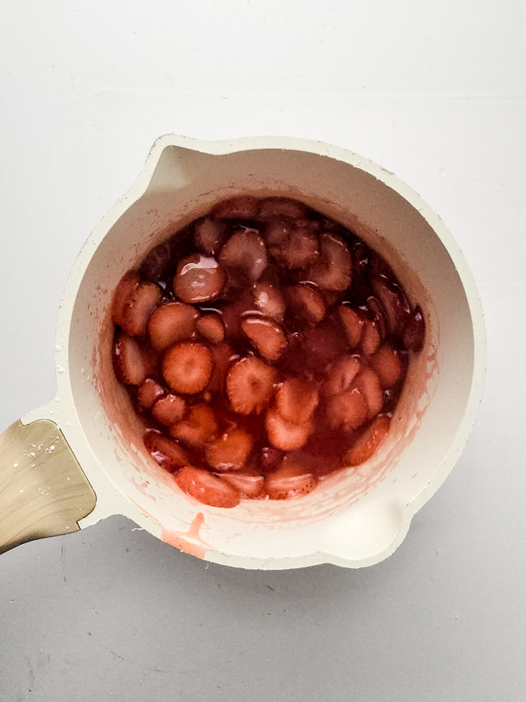 In a saucepan over medium heat, add the sliced strawberries, white sugar, water and cornstarch all at once. Stir together over the heat and let the mixture come to low boil. Remove from the heat when the strawberry sauce thickens.