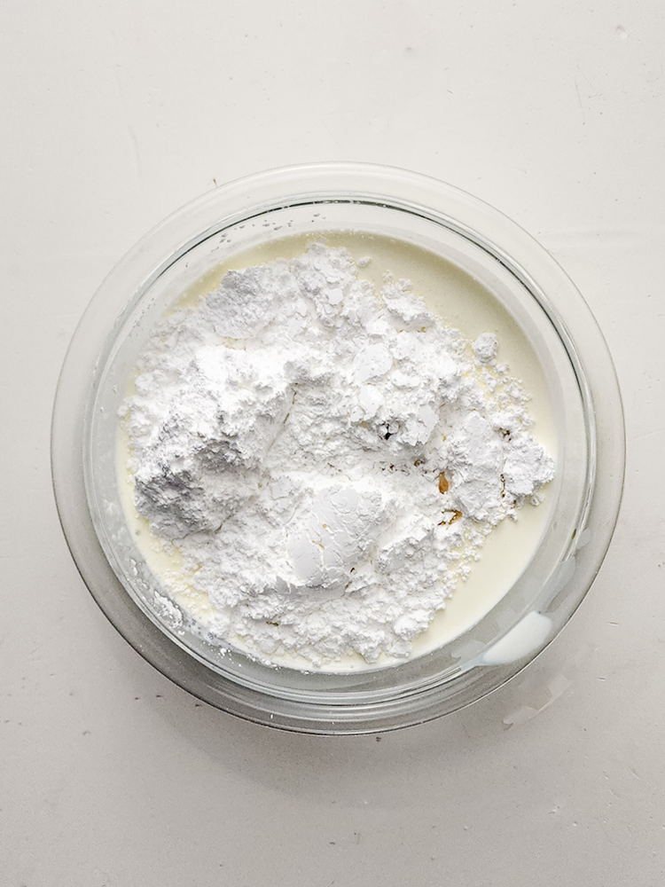 In a medium sized bowl, add the heavy whipping cream, powdered sugar, and vanilla.