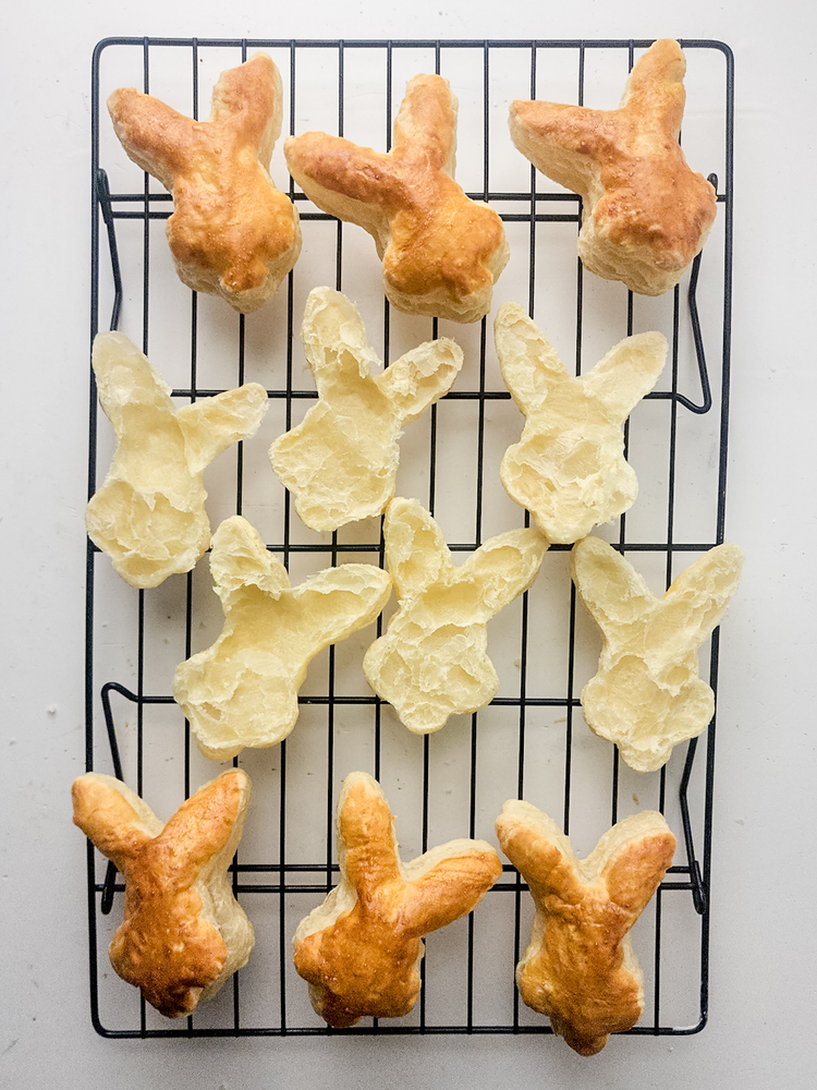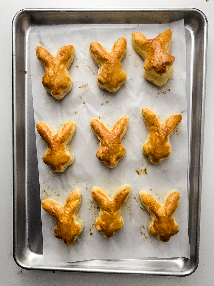 Bake these for 8-10 minutes until the tops are golden brown and the pastry bunnies have puffed up.