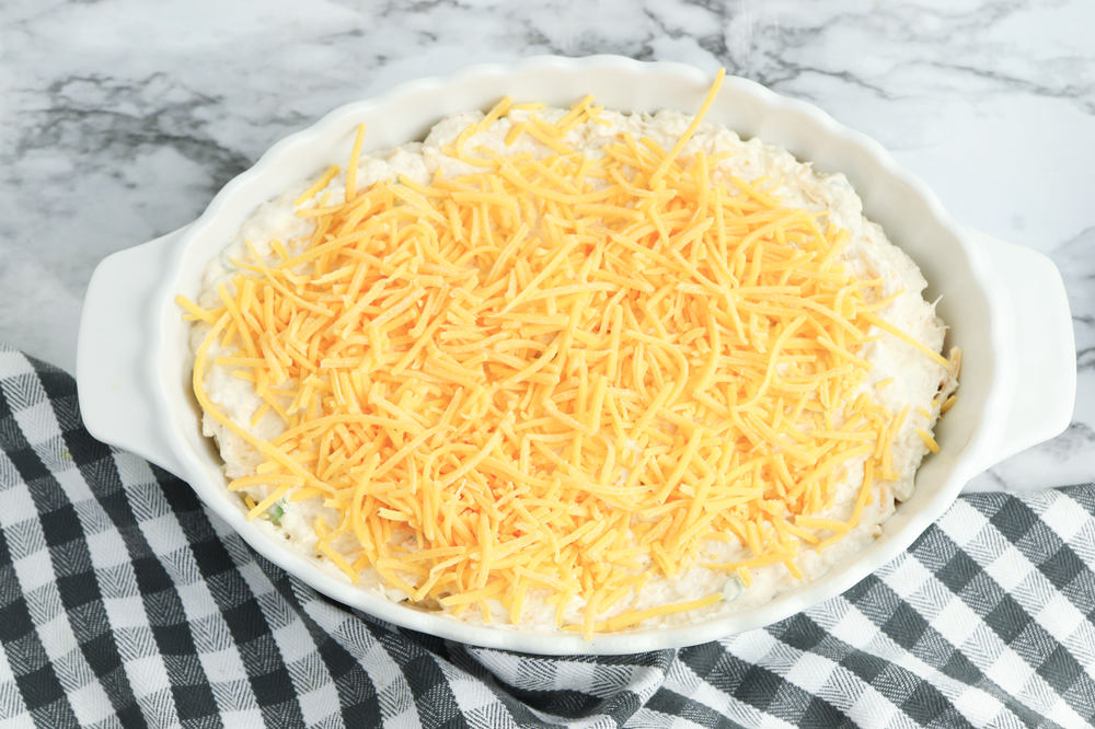 Spread the mixture in a baking dish or pie plate and top with remaining cheddar cheese.