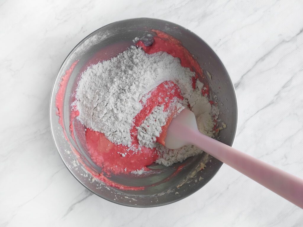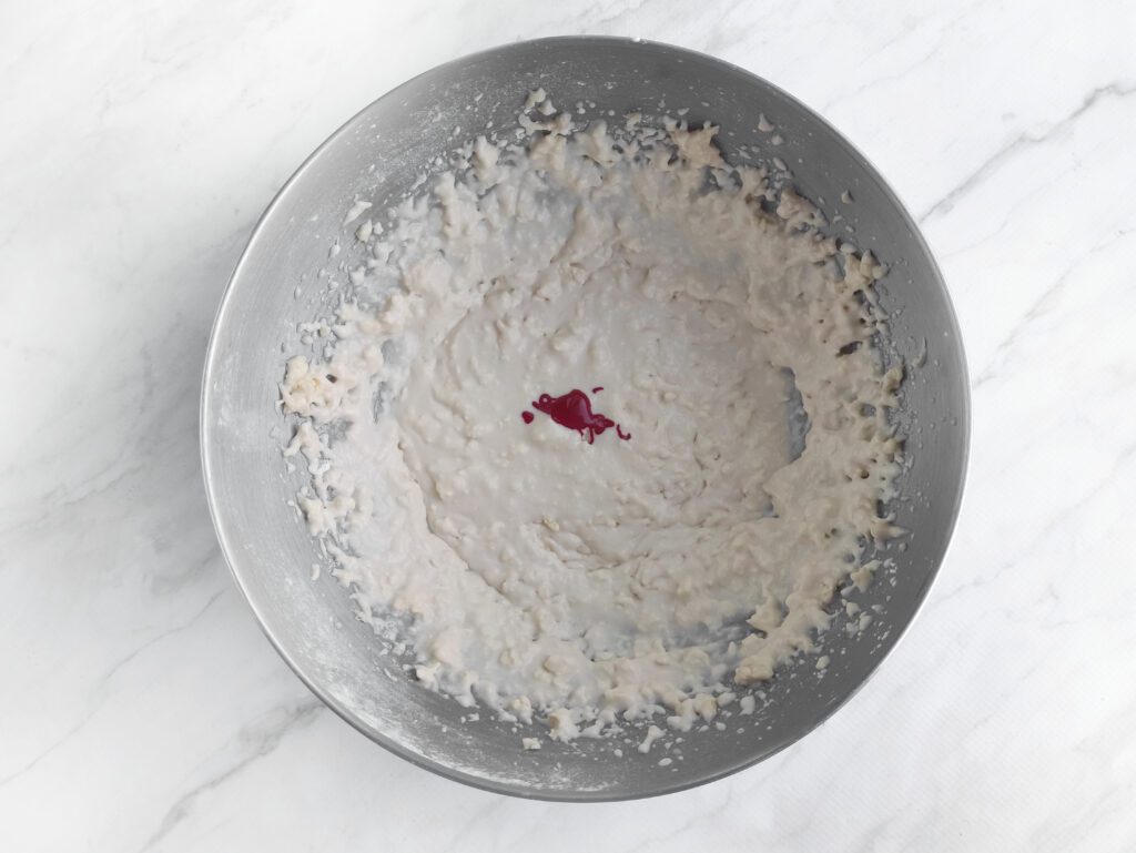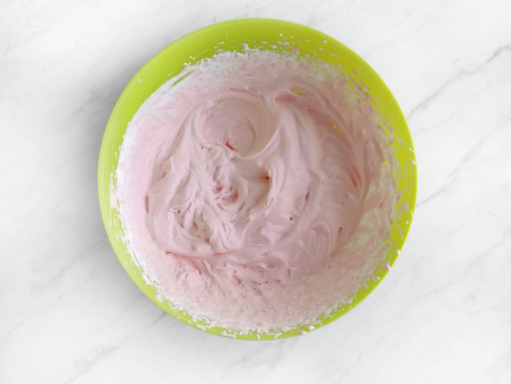 - Whip the cream with the sugar until stiff peaks form. Tint the cream a light pink color. Transfer the whipped cream to a pastry bag.