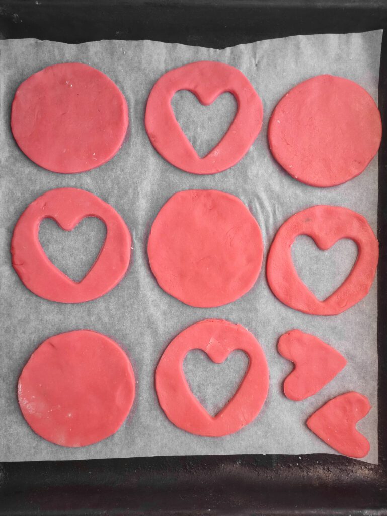 - Roll out the dough into a 1/4-inch thick dough sheet. Using a 4-inch round cutter, cut out 8 circles. Transfer the circles to a baking tray. Cut hearts in 4 of them. Place the hearts on the baking sheet. Bake for 10-12 minutes until golden. Cool the cookies on a rack.