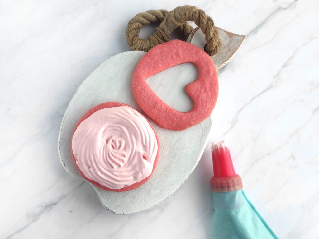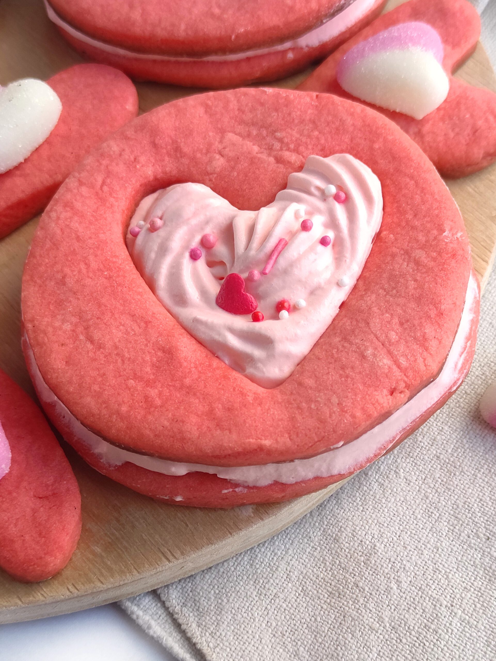 - Spread the cream on the cookie base. Place a heart cut-out cookie on top. Sprinkle with valentines before serving.